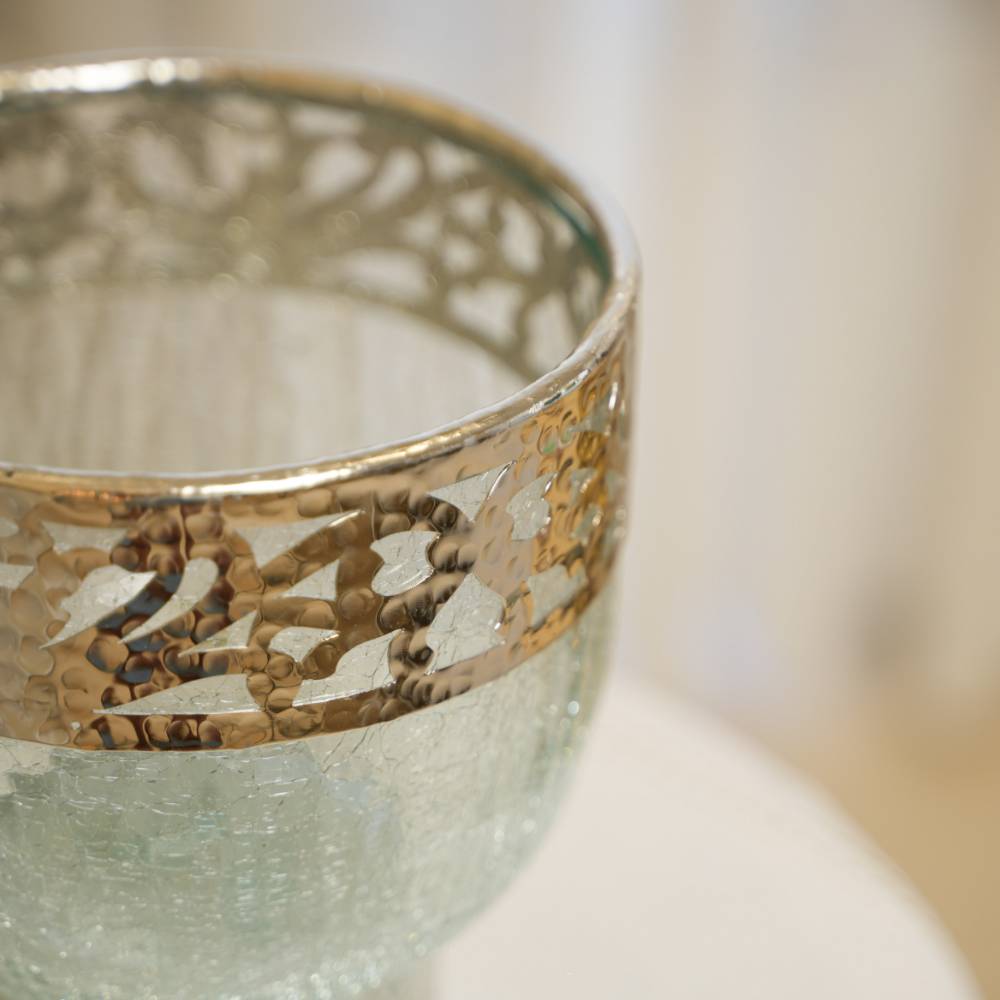 Coupe décorative « gris bleuté 1» : mariage entre le verre soufflé et le cuivre ajouré.