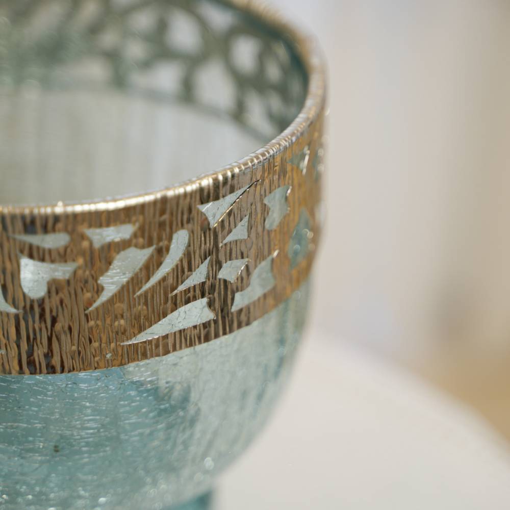 Coupe décorative «bleu gris»: mariage entre le verre soufflé et le cuivre ajouré.