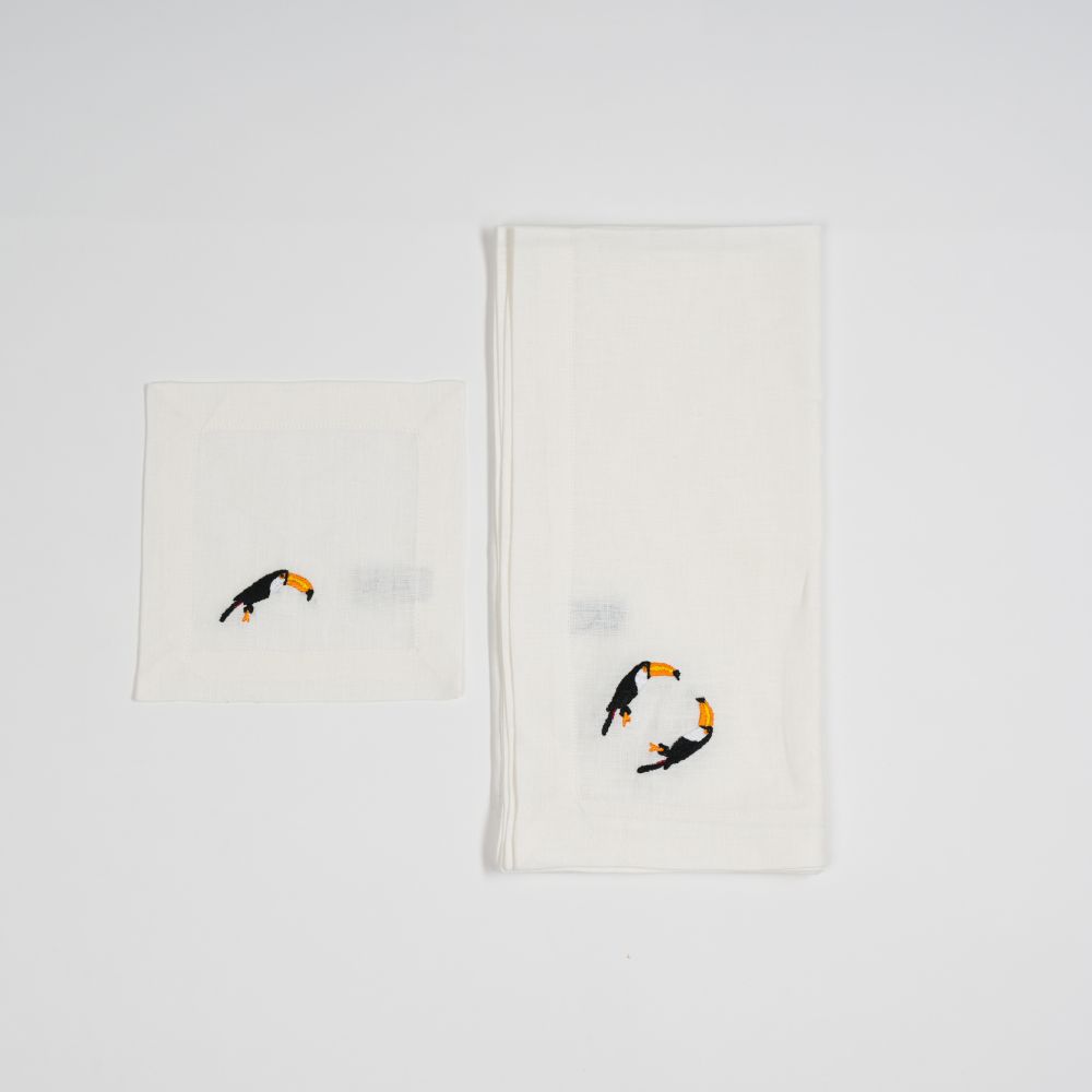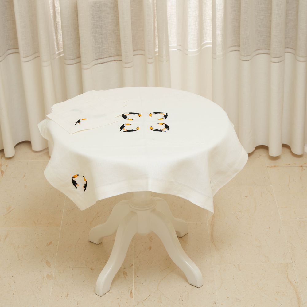 Nappe à thé « Corbeau 2 » en lin, point « relief » fait main, brodée au fil DMC avec six serviettes assorties.