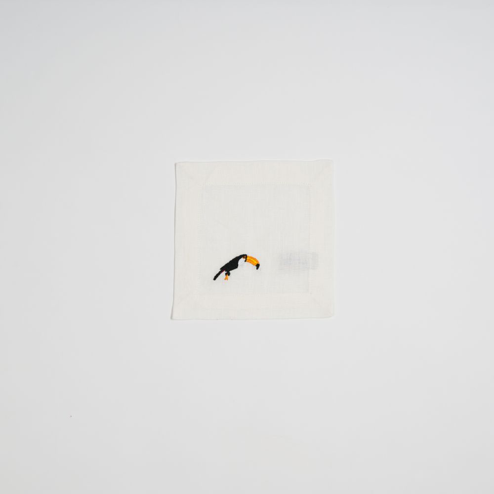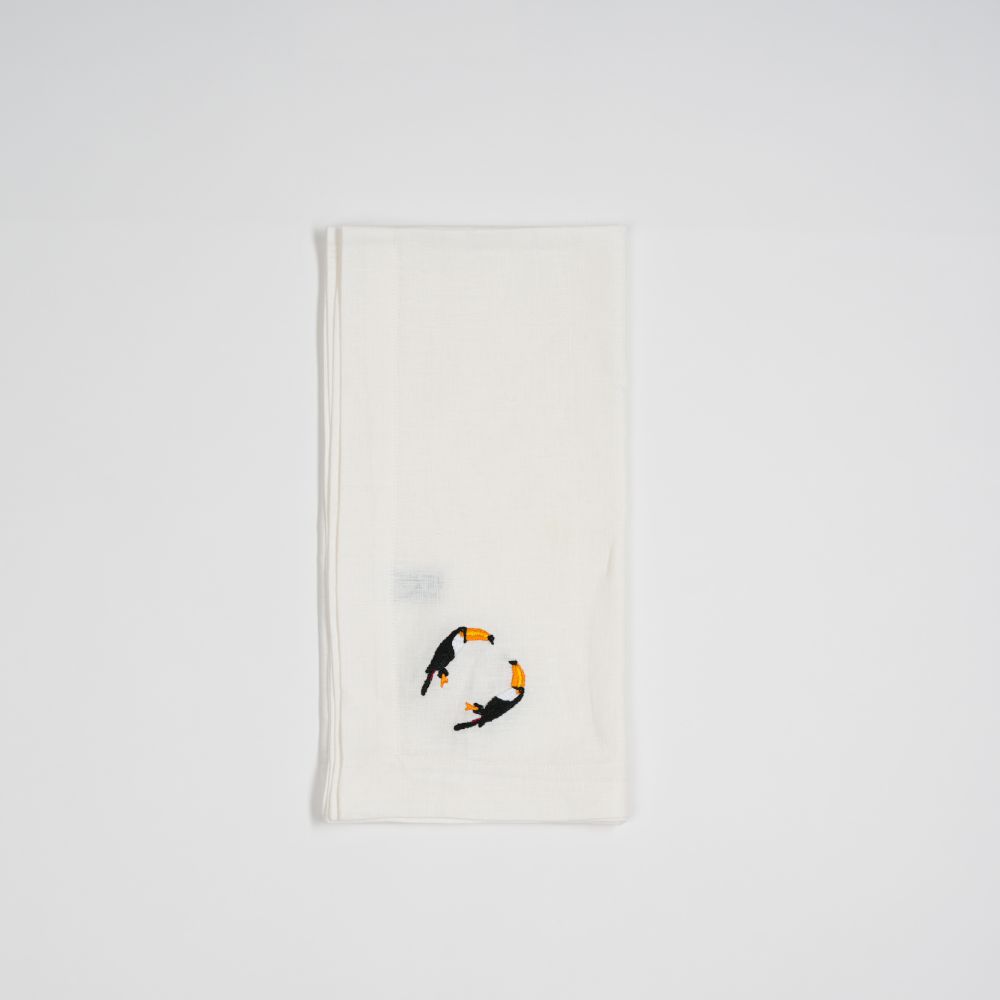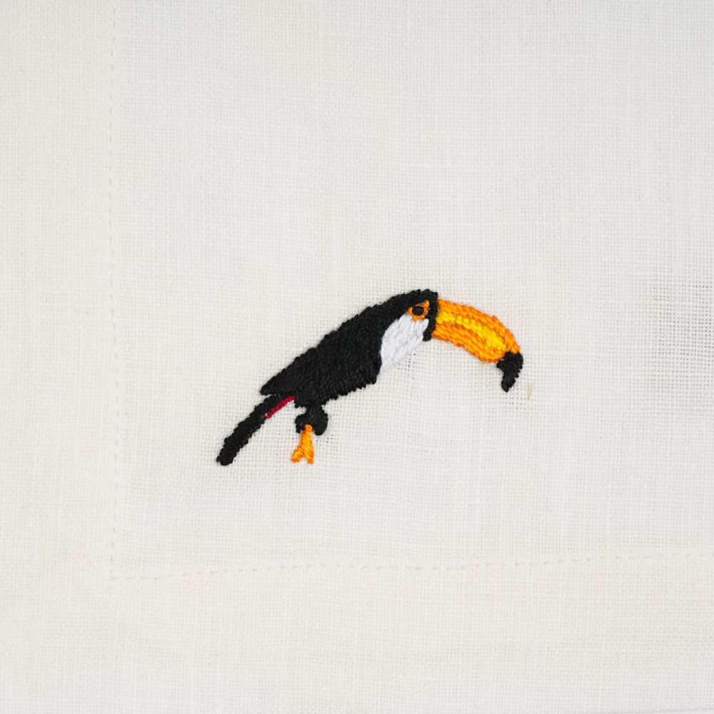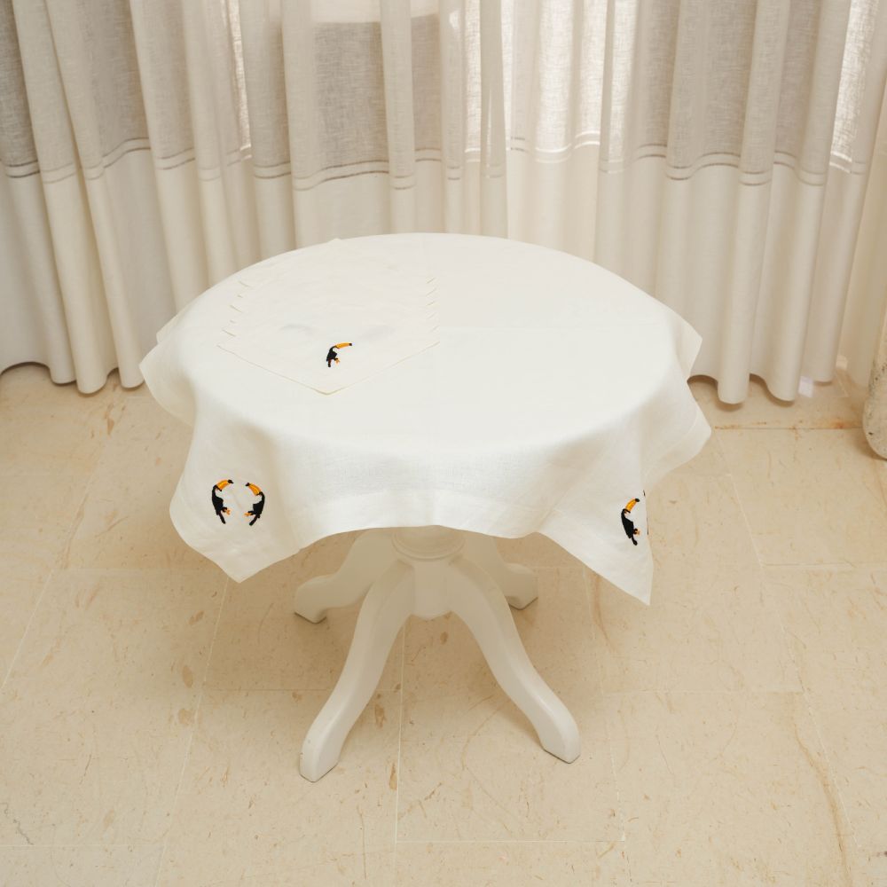 Nappe à thé « Corbeau » en lin, point « relief » fait main, brodée au fil DMC avec six serviettes assorties.