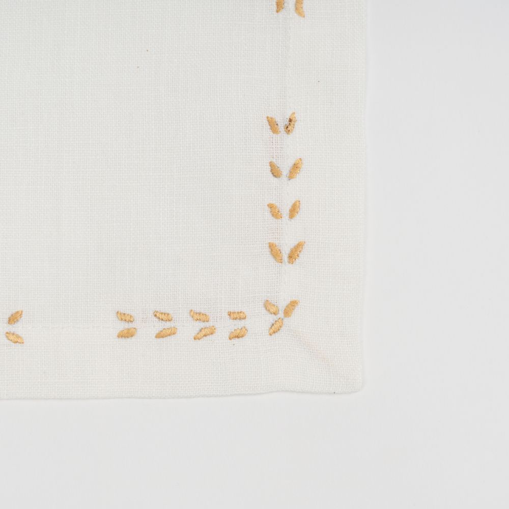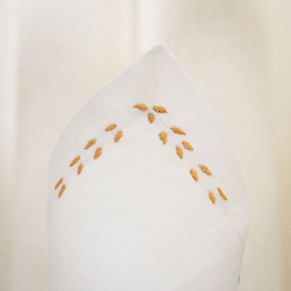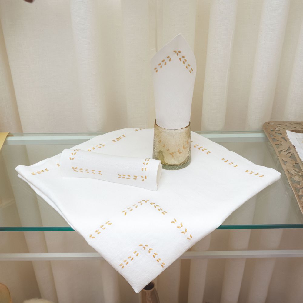 Nappe à thé «Epines» en lin, point « relief » fait main, brodée au fil DMC avec six serviettes assorties.