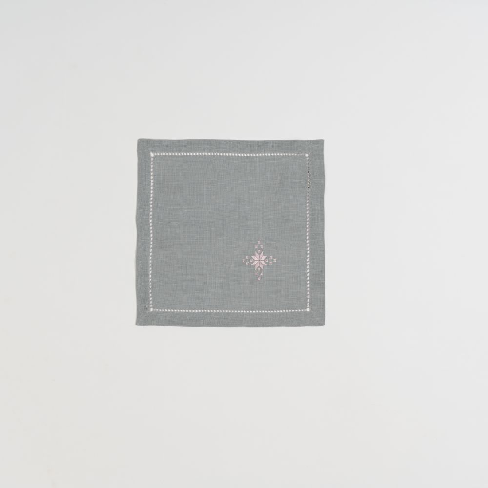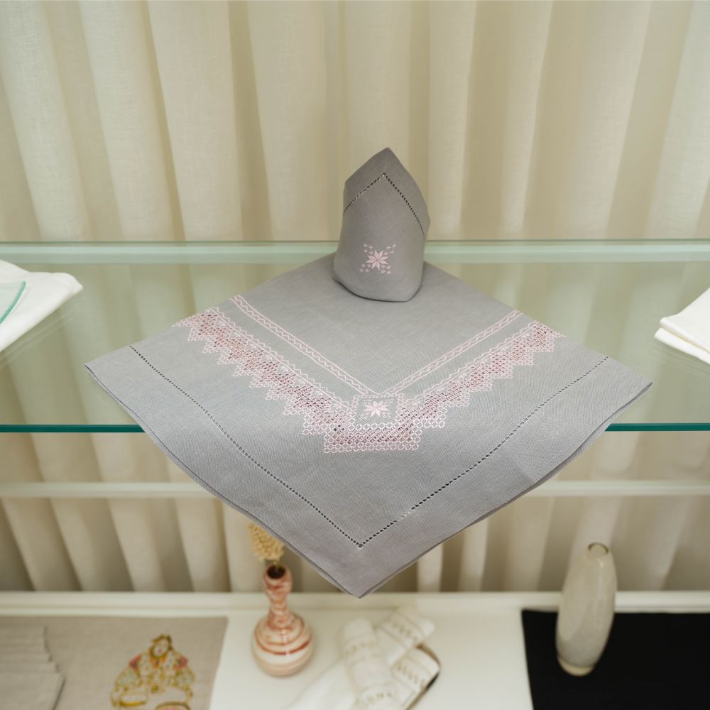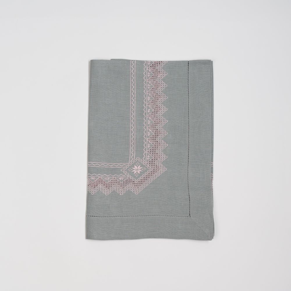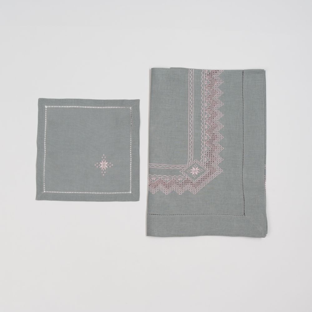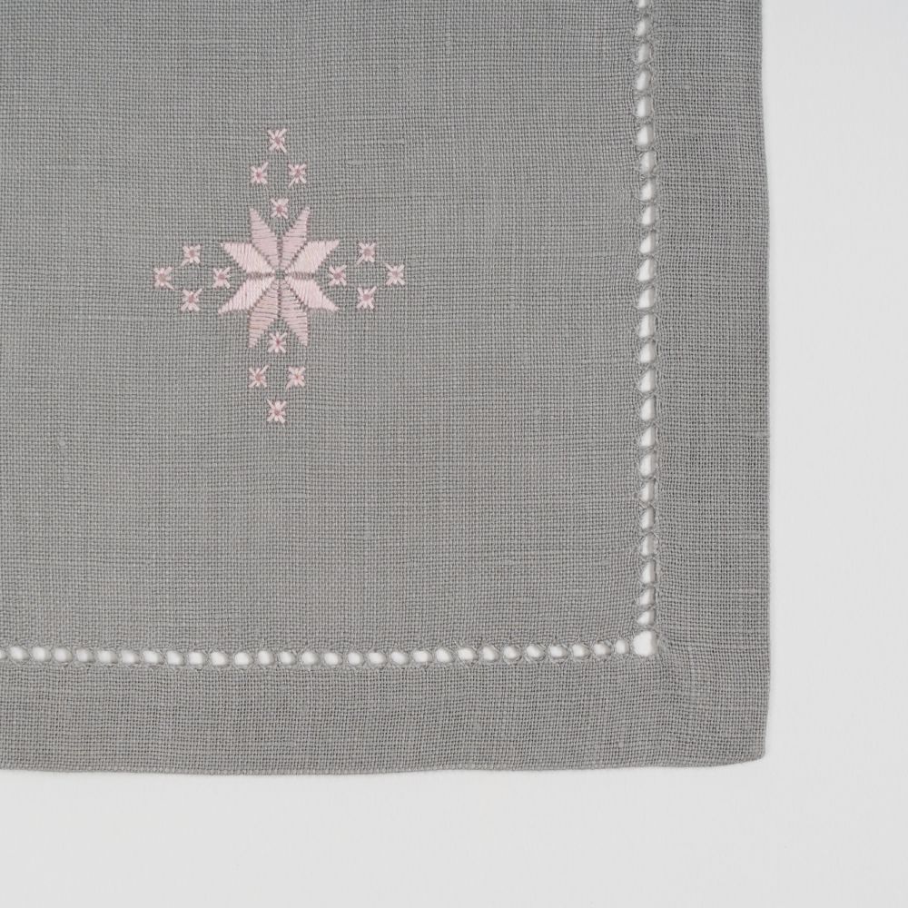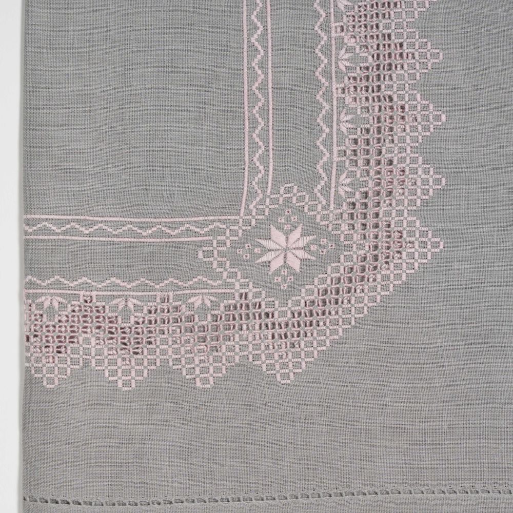 Nappe à thé «Norvège Rose» en lin gris, point de « Norvège » fait main, avec douze serviettes assorties.