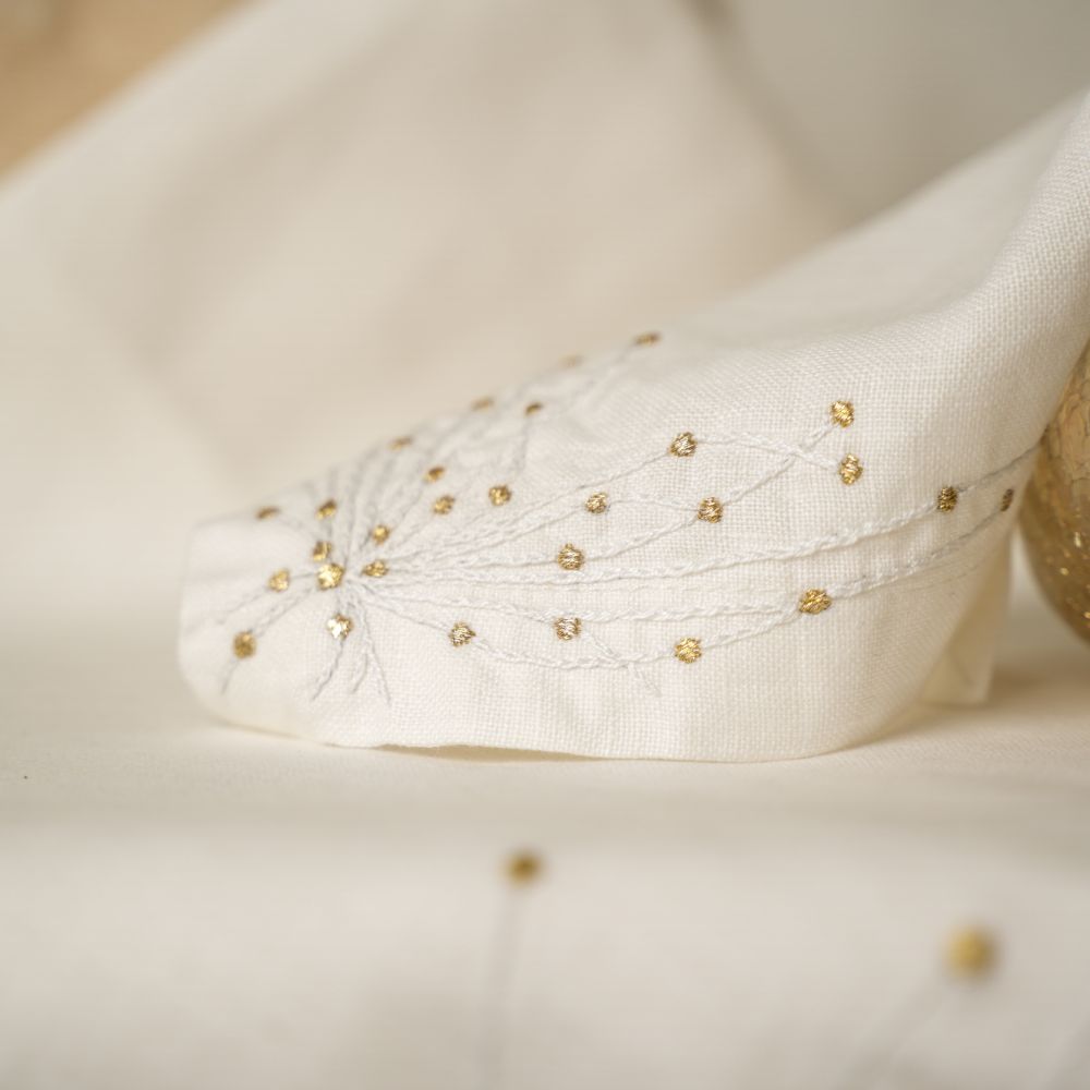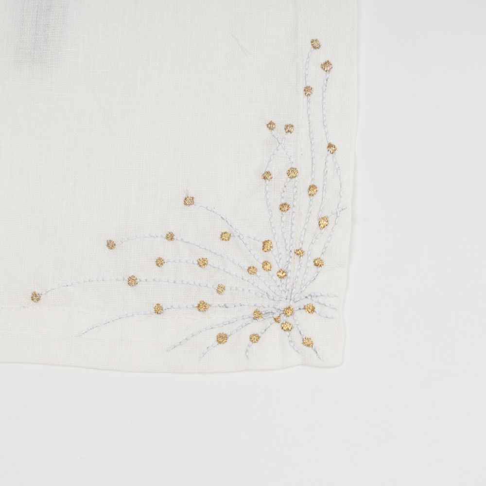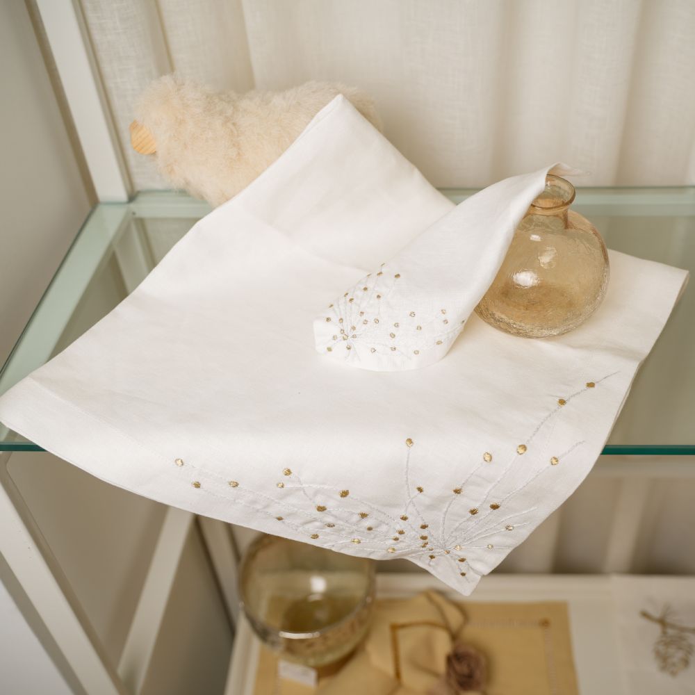 Nappe à thé «Tiges dorées » en lin, point « relief » fait main, brodée au fil DMC et au fil doré avec six serviettes assorties.
