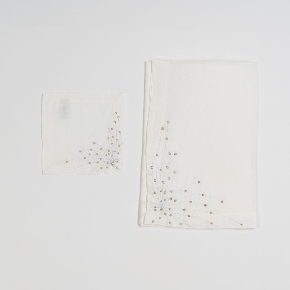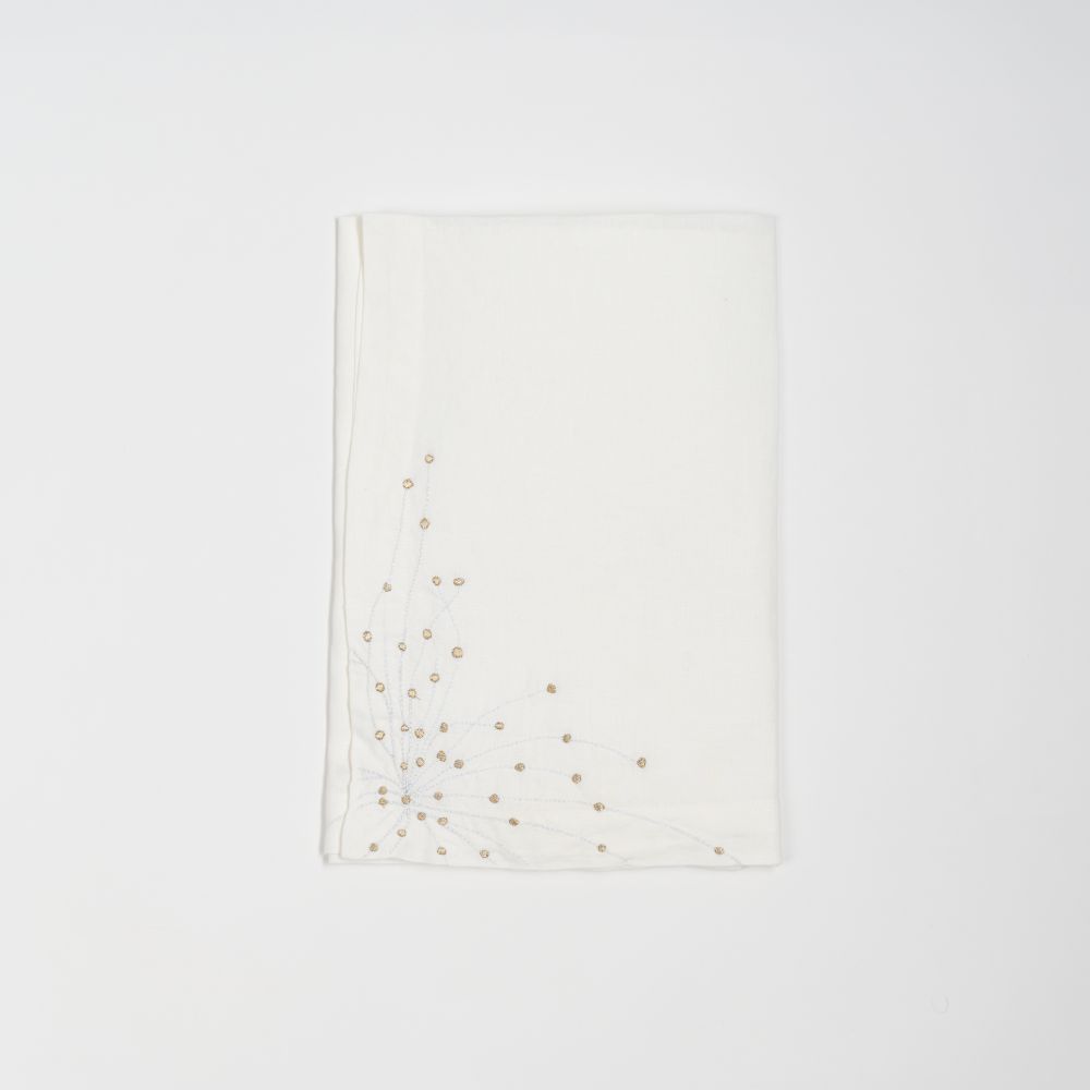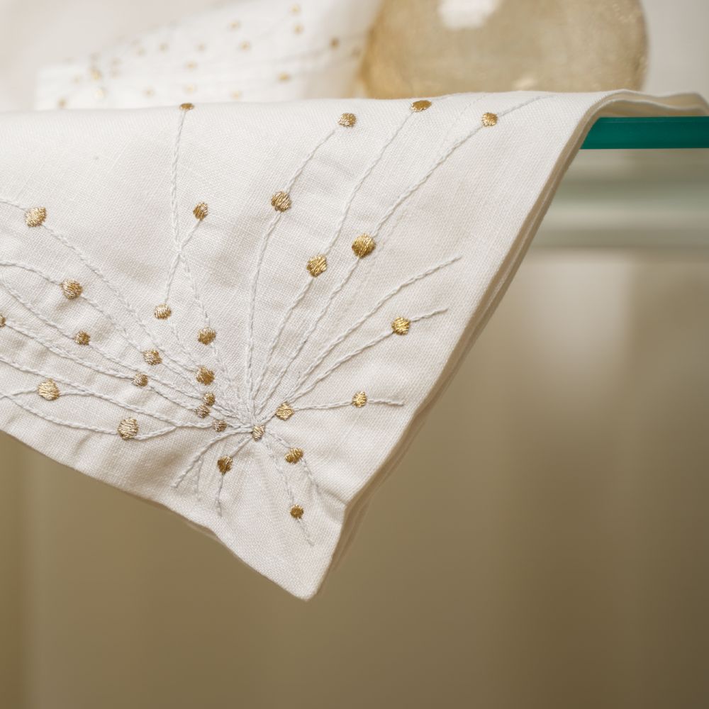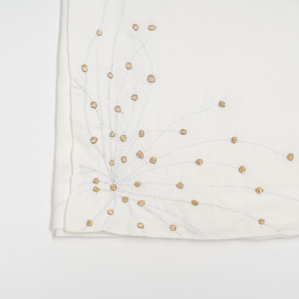 Nappe à thé «Tiges dorées » en lin, point « relief » fait main, brodée au fil DMC et au fil doré avec six serviettes assorties.
