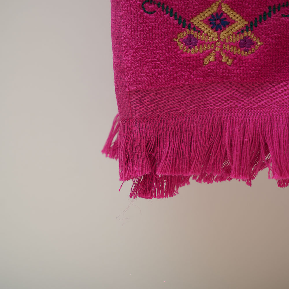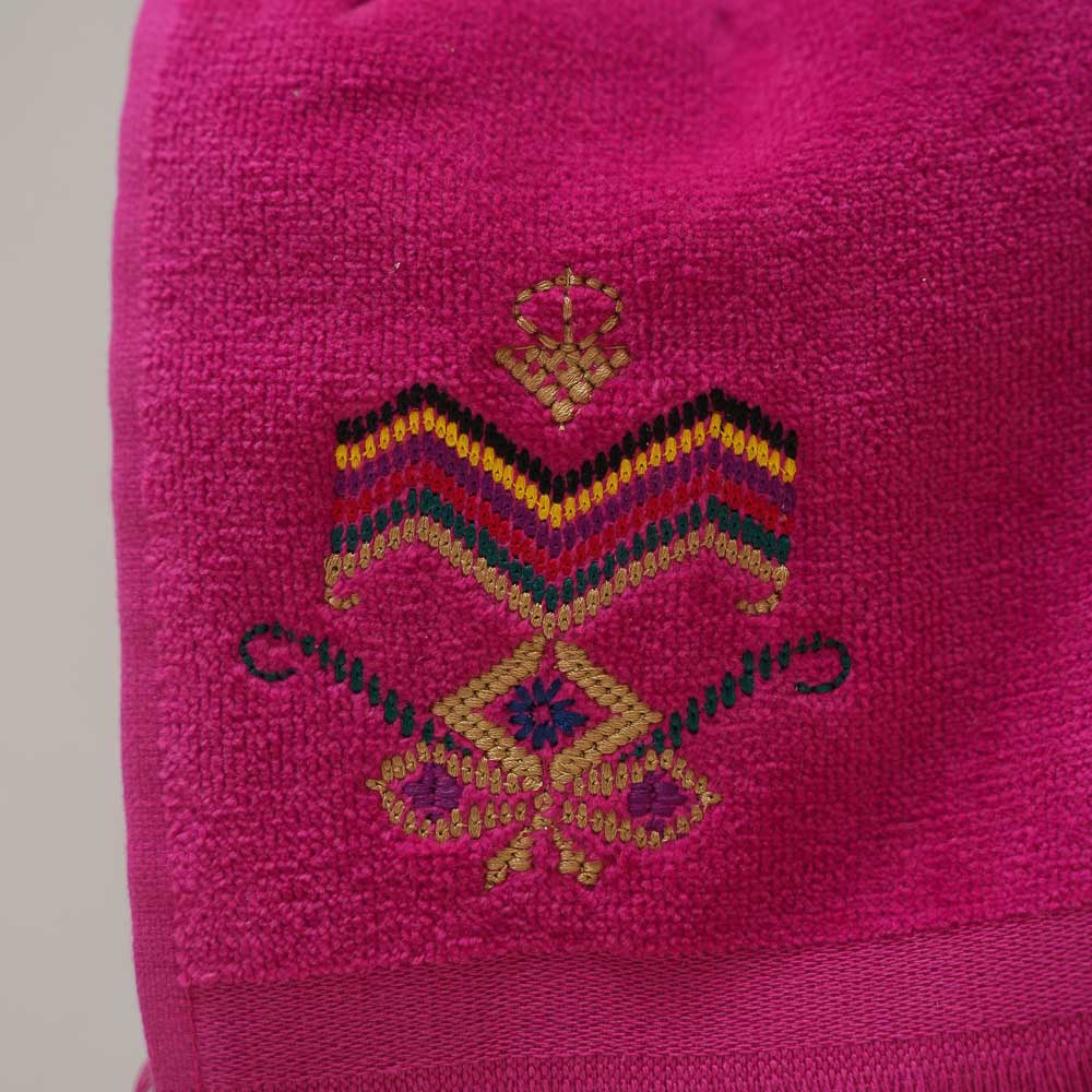 Serviette de bain « rose bonbon » brodée à la machine, motif traditionnel.