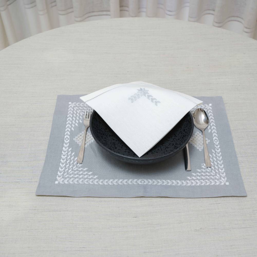 Pack de six sets de table « Norvège 4» en lin gris, point de « Norvège » faits main, avec serviettes assorties.