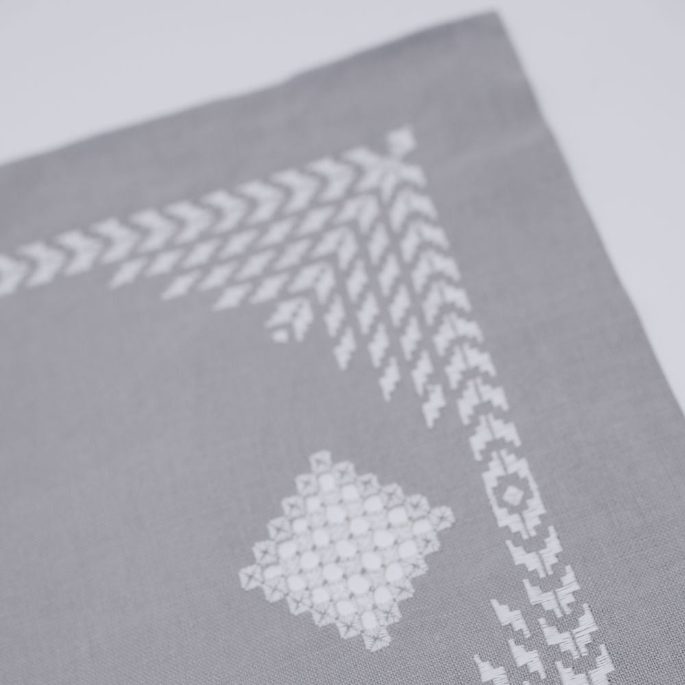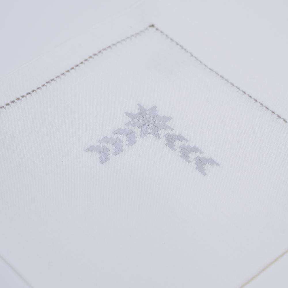 Pack de six sets de table « Norvège 4» en lin gris, point de « Norvège », fait main, avec serviettes assorties.