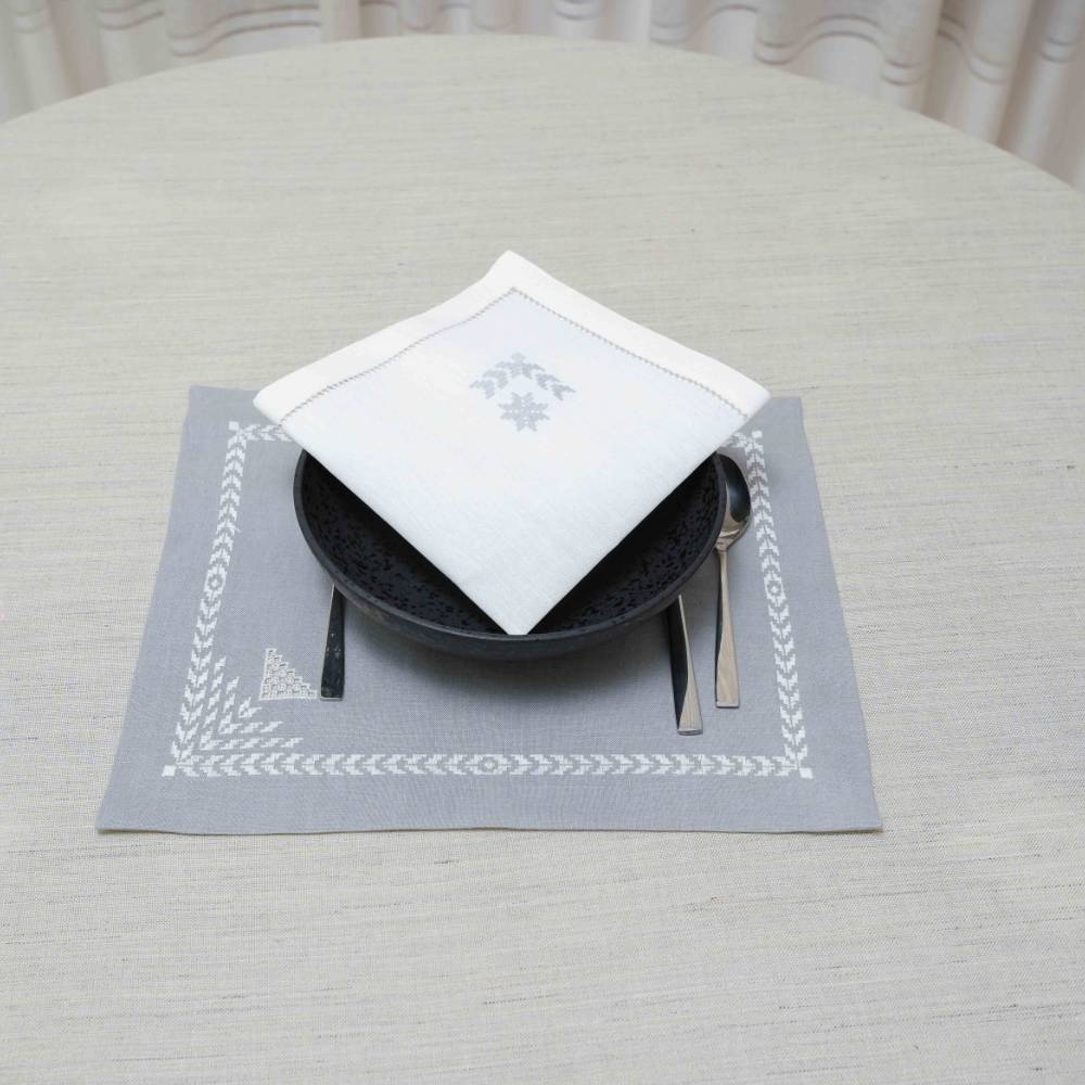 Pack de six sets de table « Norvège 5» en lin gris, point de « Norvège » faits main, avec serviettes assorties.