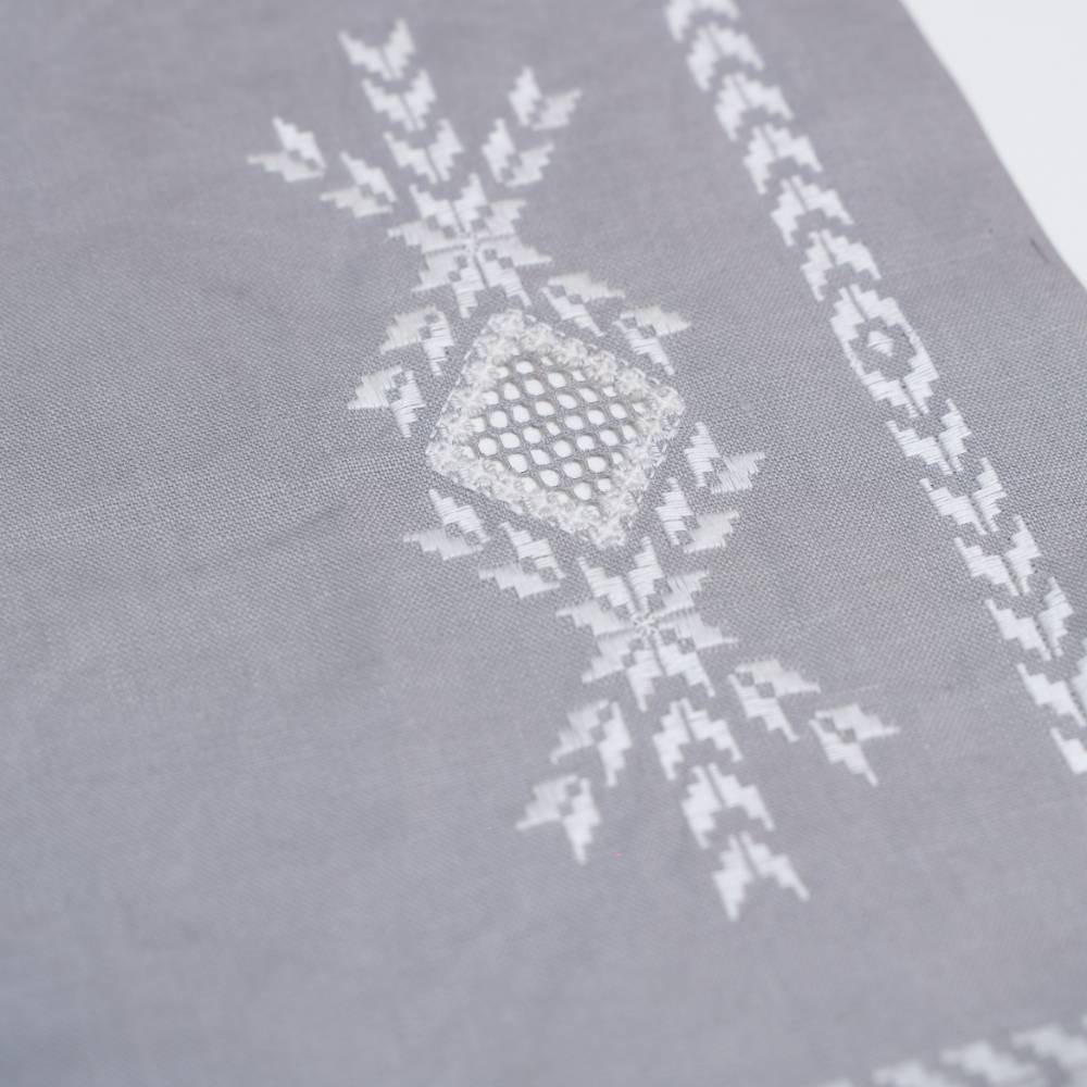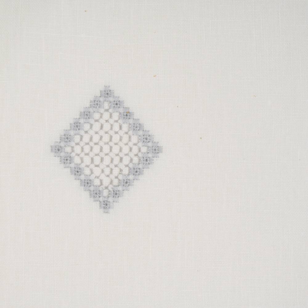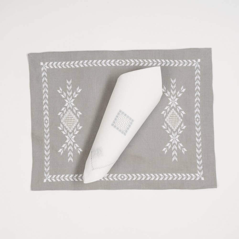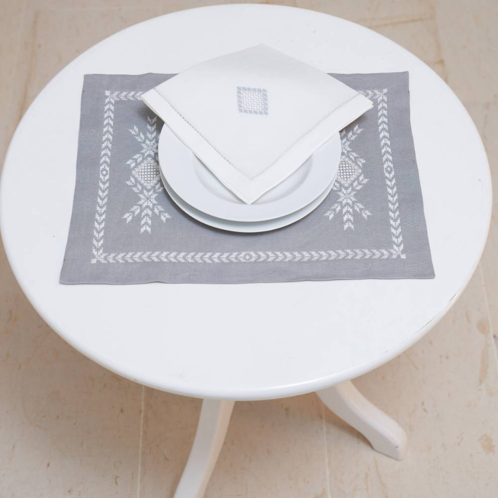 Pack de six sets de table « Norvège 1» en lin gris, point de « Norvège » faits main, avec serviettes assorties.