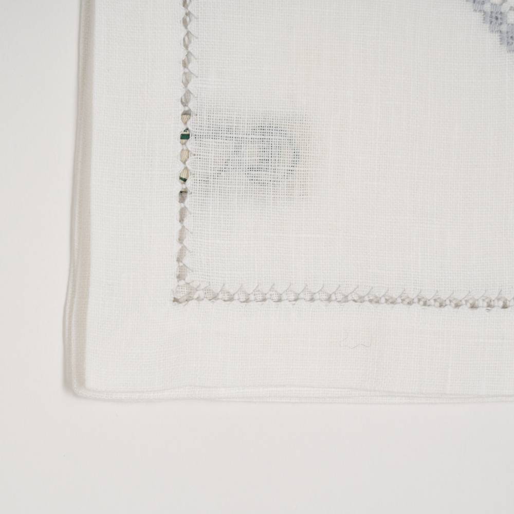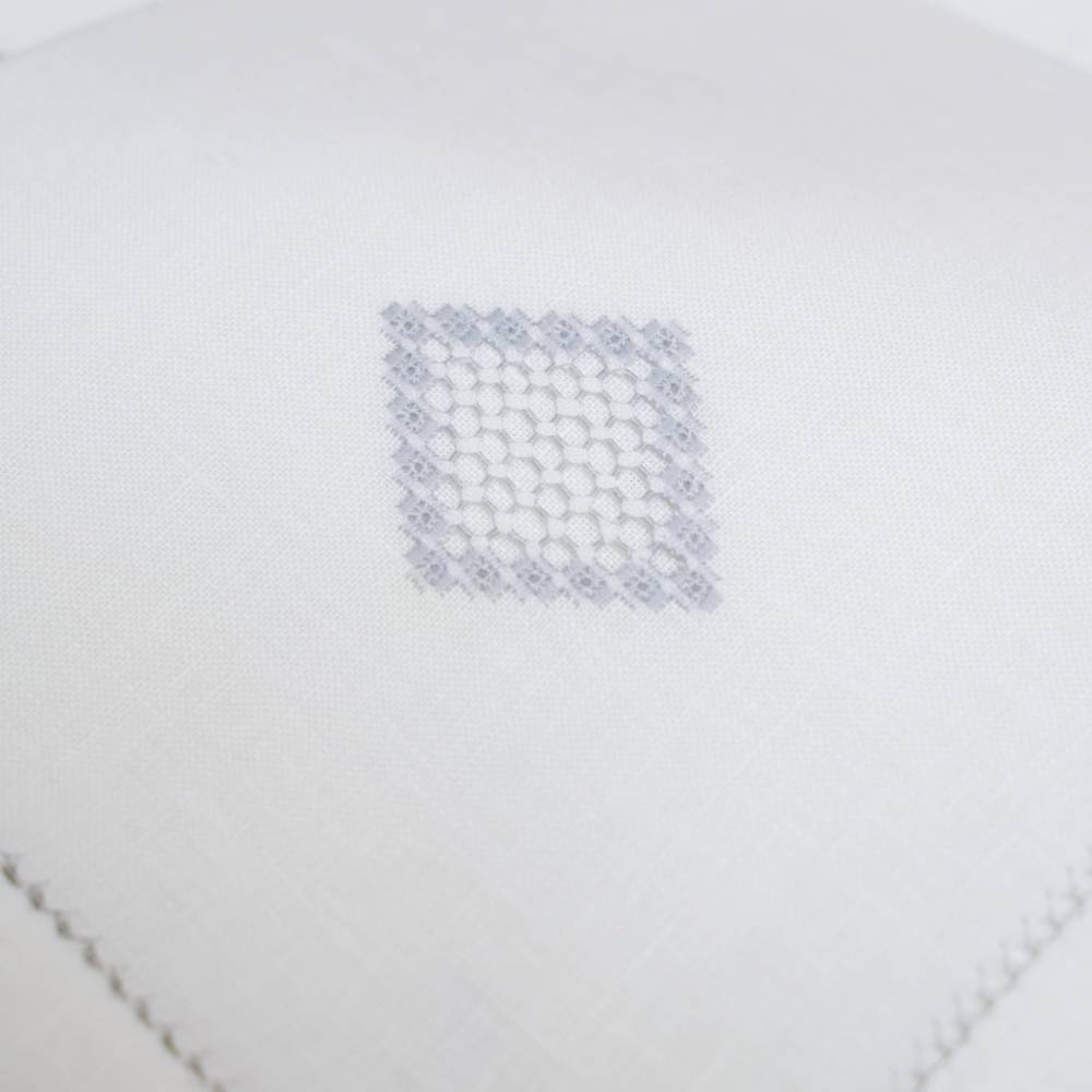 Pack de six sets de table « Norvège 1 » en lin gris, point de « Norvège » faits main, avec serviettes assorties.