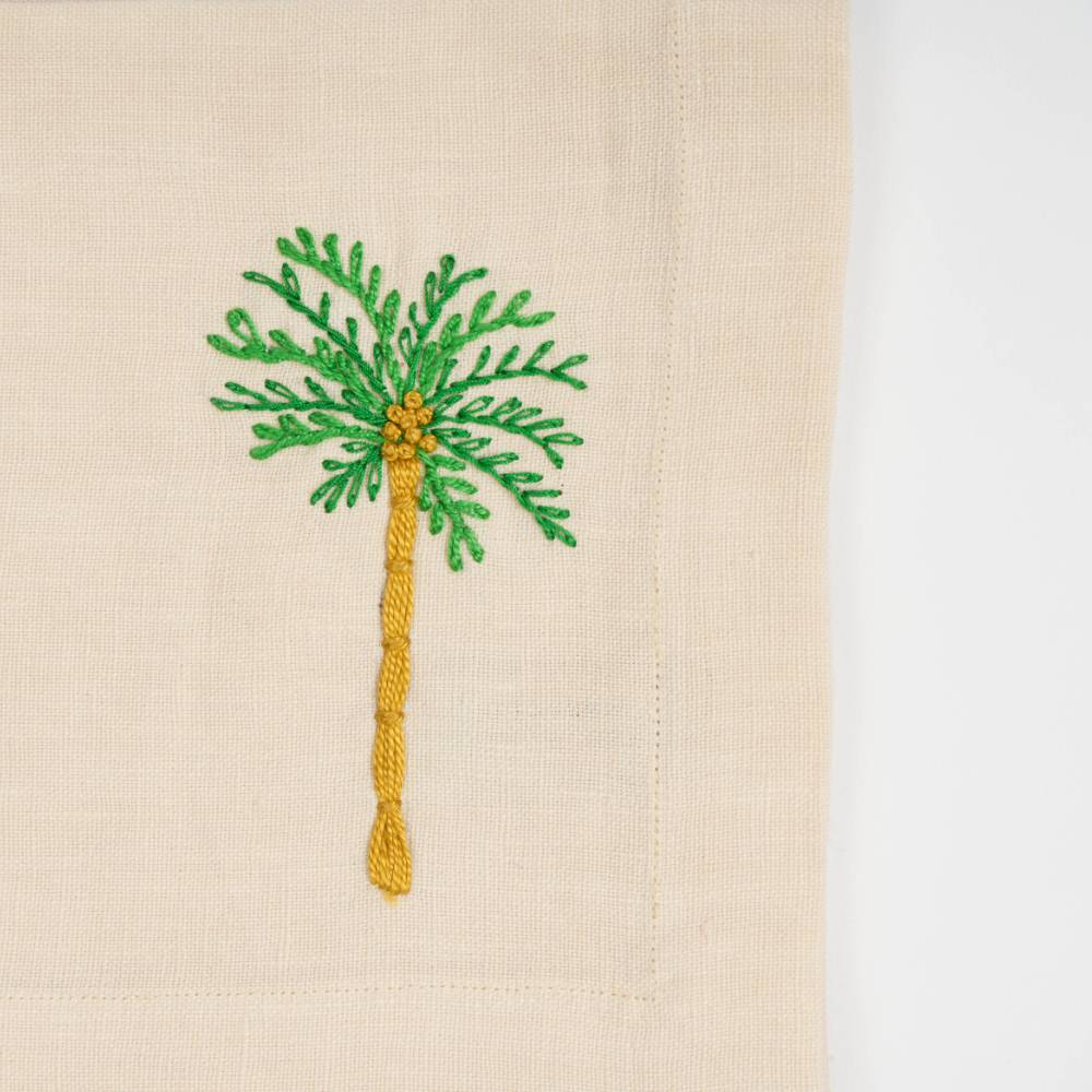 Pack de six sets de table « Palmier » en lin, brodés à la main- point « relief », avec serviettes et anneaux assortis.