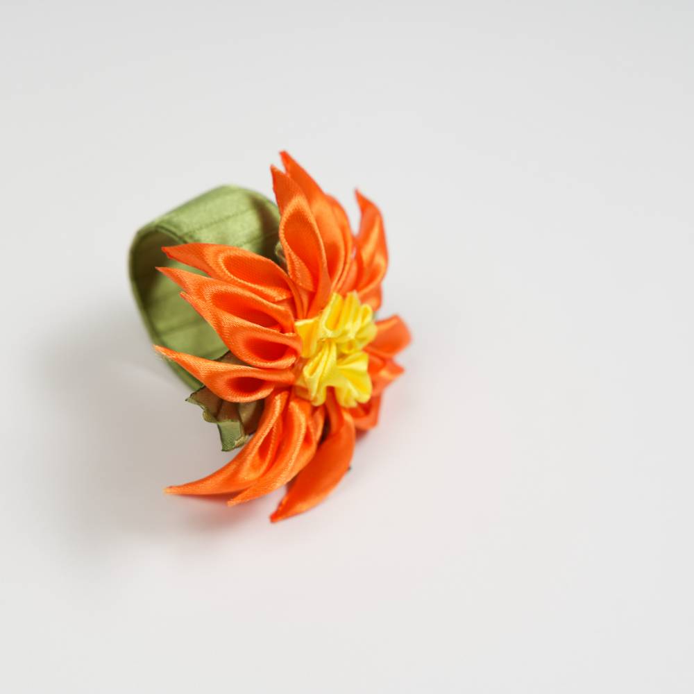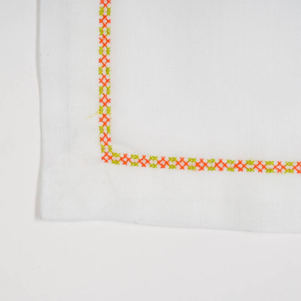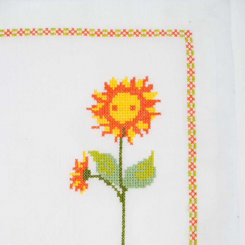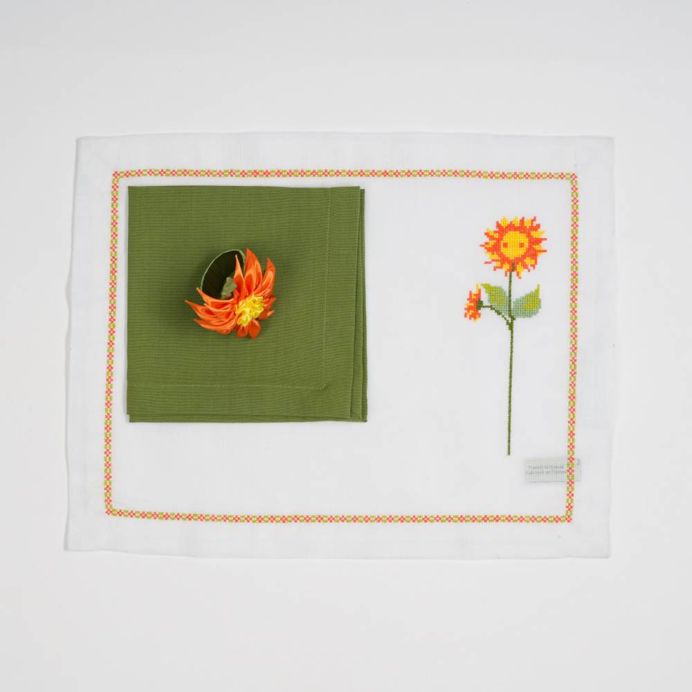 Pack de six sets de table « Tournesol orange» en point de croix faits main, avec serviettes et anneaux assortis.