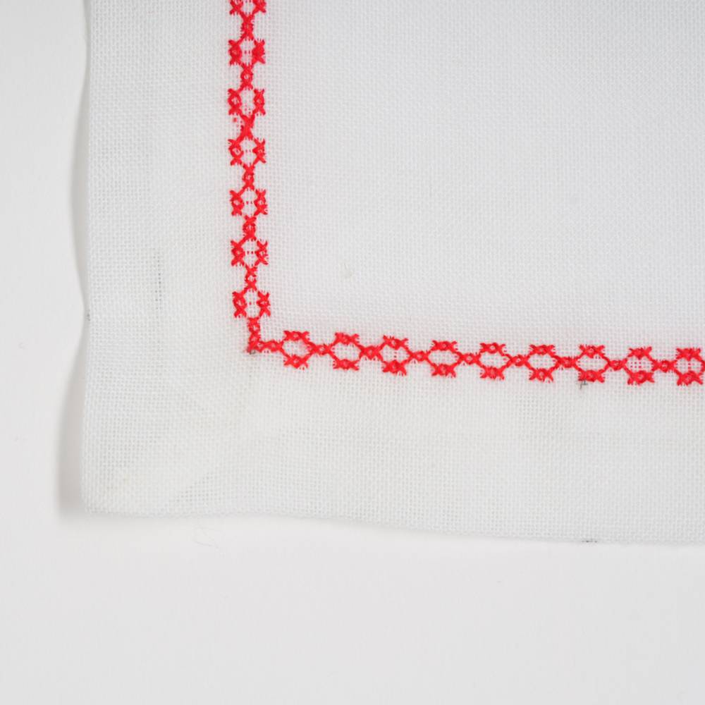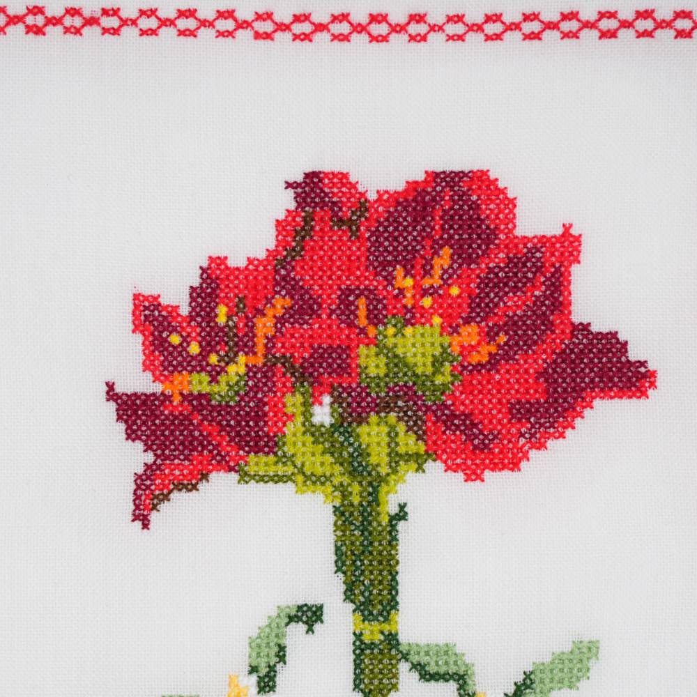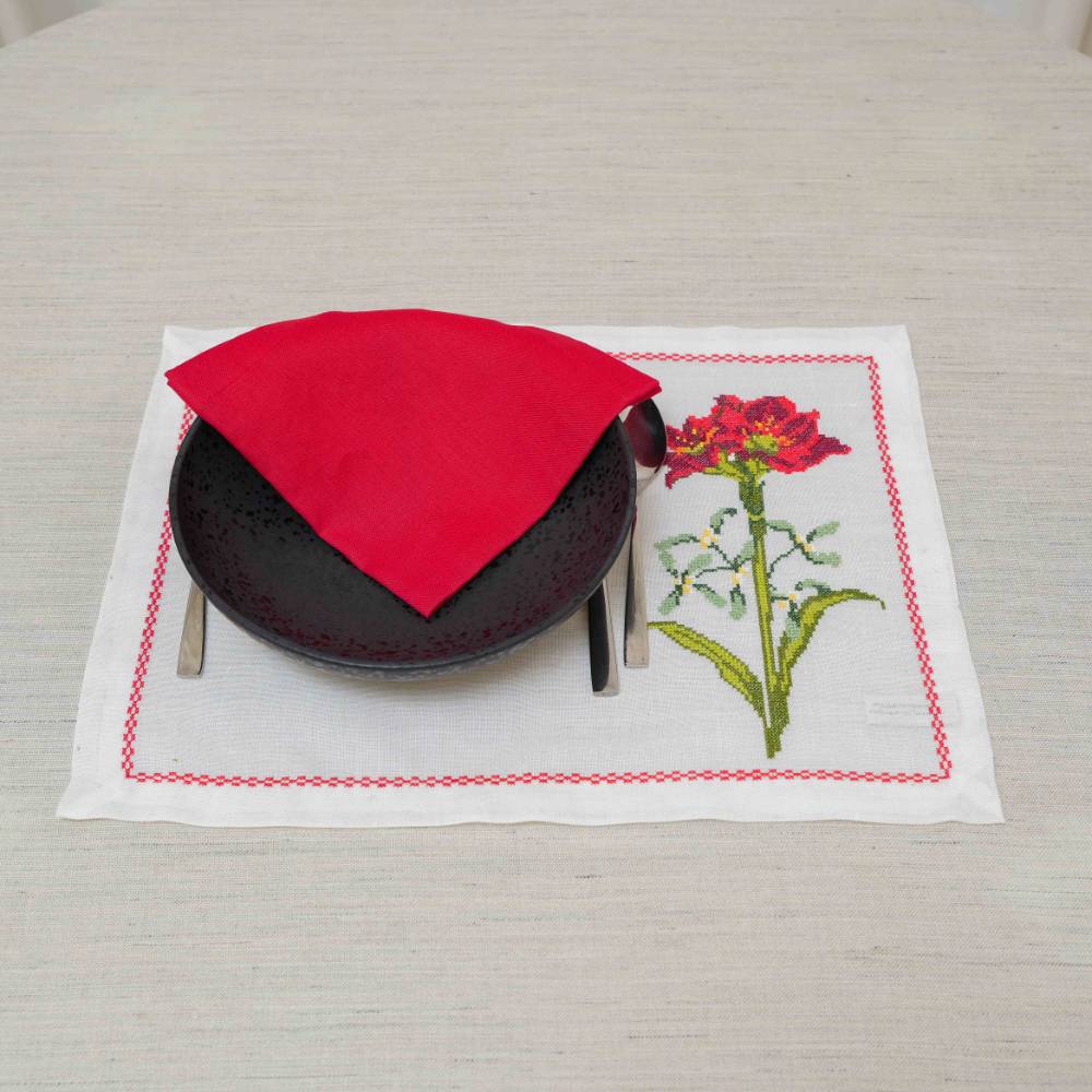 Pack de six sets de table « Tulipe » en point de croix- fait main, avec serviettes et anneaux assortis.